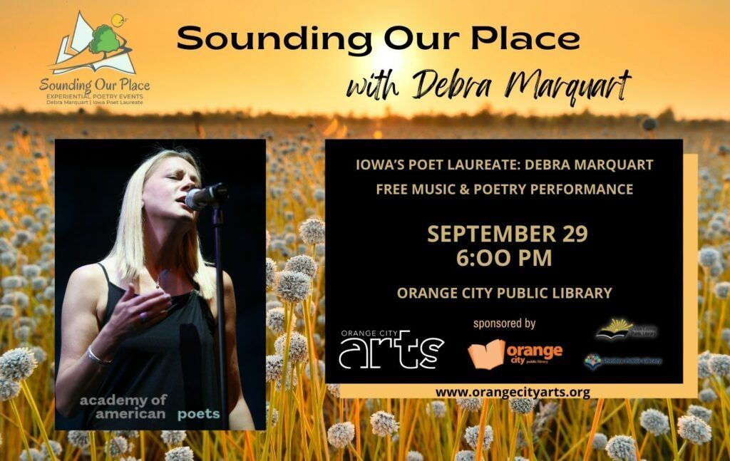 In partnership with the Orange City Public Library, Orange City Arts will host a free musical performance and poetry reading by Debra Marquart, a distinguished Professor of Liberal Arts & Sciences at Iowa State University. Marquart teaches in the MFA Program in Creative Writing and Environment and serves as Iowa’s Poet Laureate and the Senior Editor of Flyway: Journal of Writing & Environment. Marquart’s performance is a part of the program ‘ Sounding Our Place,’ a proposed series of experiential literary events that pair an interest in place, the natural world, and environmental issues with poetry/storytelling, songwriting, and creative writing workshops. These events will be planned around the state of Iowa and designed to reach communities in the rural corners and urban areas of the state that do not generally receive attention in arts programming to encourage creative expressive arts.