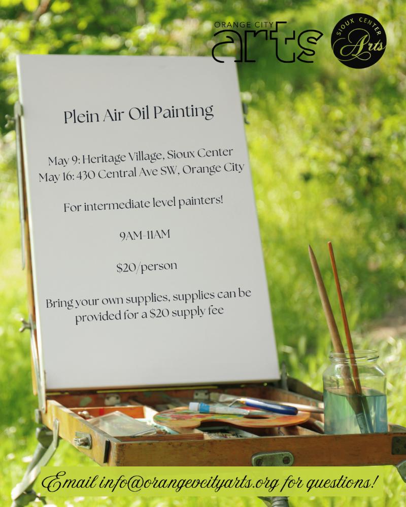 CALLING LOCAL OIL PAINTERS! If you're interested in painting alongside fellow artists, come join us on May 9th and 16th to come paint with a group of other intermediate oil painters, led by Dordt University's Chadd Caldwell! Both sessions will be held from 9-11AM. The first session will be held at Heritage Village (701 2nd Ave SW) in Sioux Center. The second session will be held on the front lawn of Chadd's home (430 Central Ave SW) in Orange City. The first session will give you the quiet atmosphere of Heritage Village in the morning hours, while the second the second session will put you on the Orange City's scenic Central Ave while the tulips are in bloom!