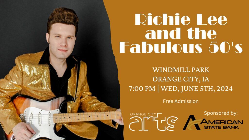 Orange City, Iowa – Orange City Arts is proud to once again host the rock and roll band, Richie Lee & the Fabulous 50’s at the Windmill Park downtown on June 5, 2024 at 7:00 P.M for the 2024 OnStage Kickoff. This event is sponsored by American State Bank.